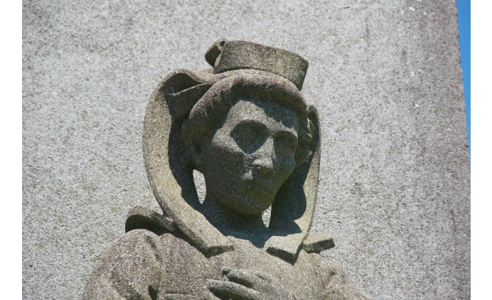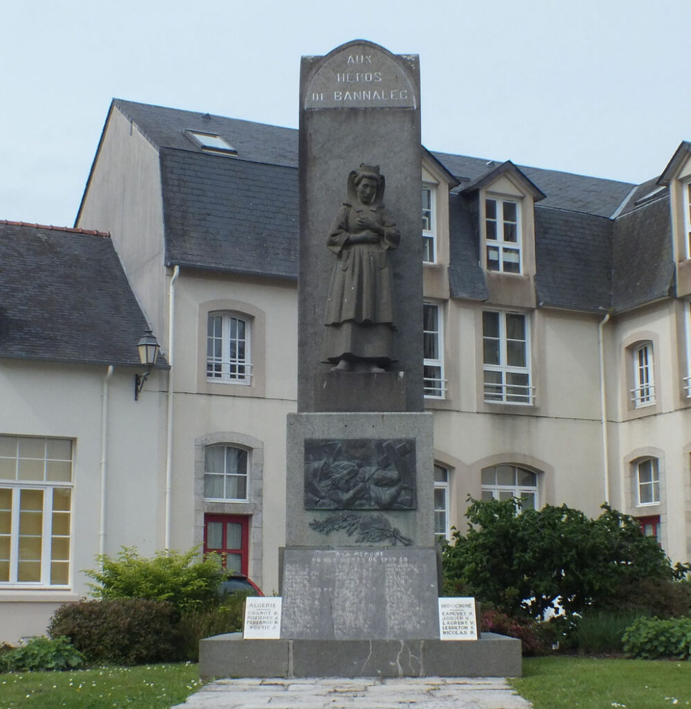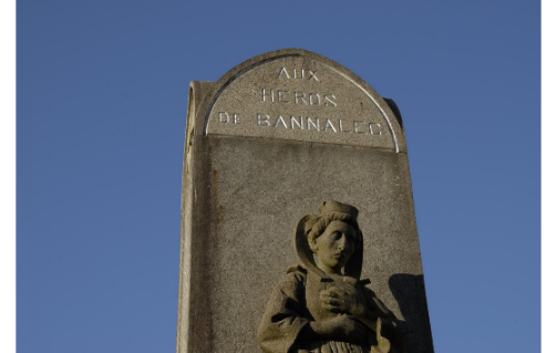 Sur le monument aux morts de Bannalec, érigé en 1921, c’est la statue d’une jeune bretonne avec coiffe qui trône à la place du traditionnel soldat. En effet, Yves Tanguy, le Maire, et les conseillers municipaux d’alors avaient souhaité la représentation d’une proche parente d’une victime de la Grande Guerre, pour souligner le rôle magistral des femmes qui ont maintenu l’activité de la commune, œuvrant aux champs avec vieillards et enfants pendant que les hommes étaient à la guerre. De plus, l’image sculptée de la femme atteste la volonté de bretonniser le monument en faisant appel à des artistes régionaux réputés. Un casting a donc été organisé par René Quillivic et une jeune fille d’à peine 20 ans a été choisie. C’était la sœur de l’aviateur Jean Bourhis (natif de la commune et mort au front en 1916), Marie Bourhis. Elle porte là le costume de deuil de Bannalec, mais sans la cape signe de grand deuil. Ses pieds sont visibles, car après la guerre la jupe avait été raccourcie.
